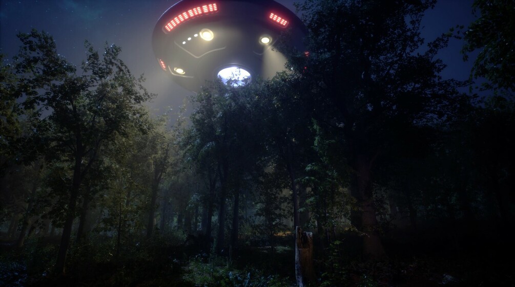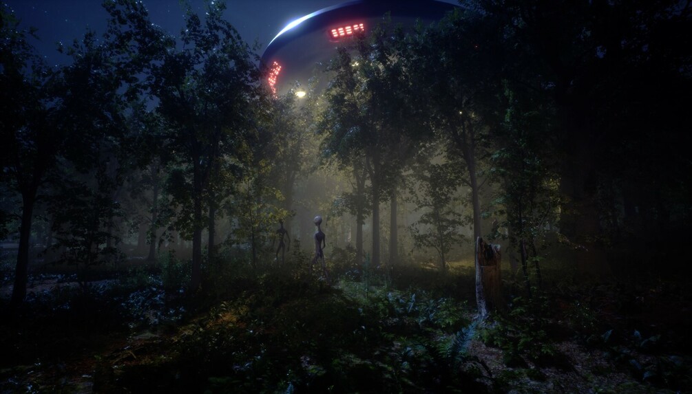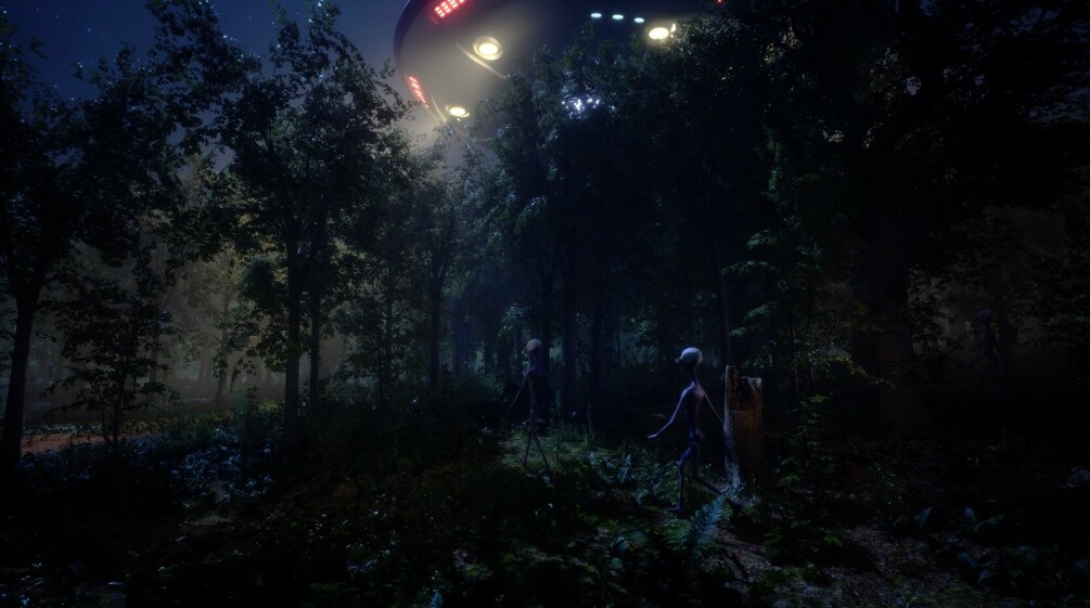A 4k realistic video animation of aliens walking in the woods close to a UFO hovering. Perfect for your lecture or UFO doc.